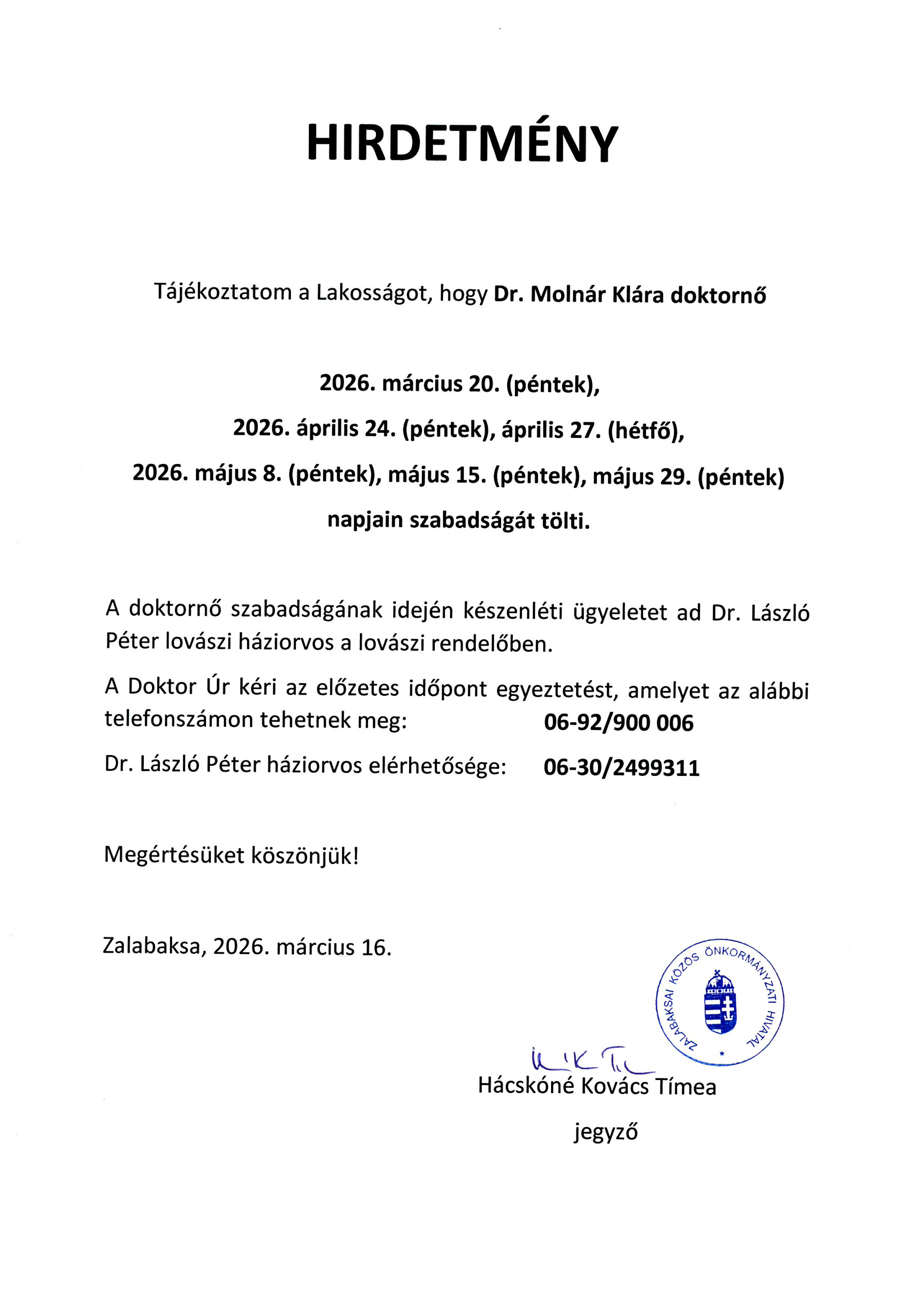 Háziorvos szabadság 2026. tavasz